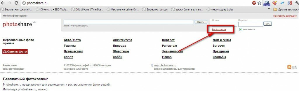 Итак, заходим на сайт http://photoshare.ru, ищем слово Регистрация:
